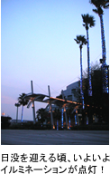 青からオレンジへ、ピンクから紫へと変わりゆく空を見つめていたら、突然、青い光がパッと灯されたの! ワタクシはびっくり&感激!
