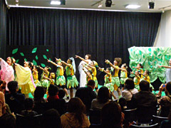 上演が始まると、緑・黄色・赤のカラフルな葉っぱの衣装に身を包んだ子供たちがズラリと登場し、お客様の目はもうステージに釘付け!