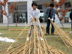 自然の葦を使って、全くかたちのない状態から制作がスタート。