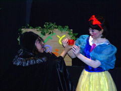 客席に毒りんごを勧める怪しげな老婆。変身した女王さまでした。白雪姫、危ない!気をつけて!